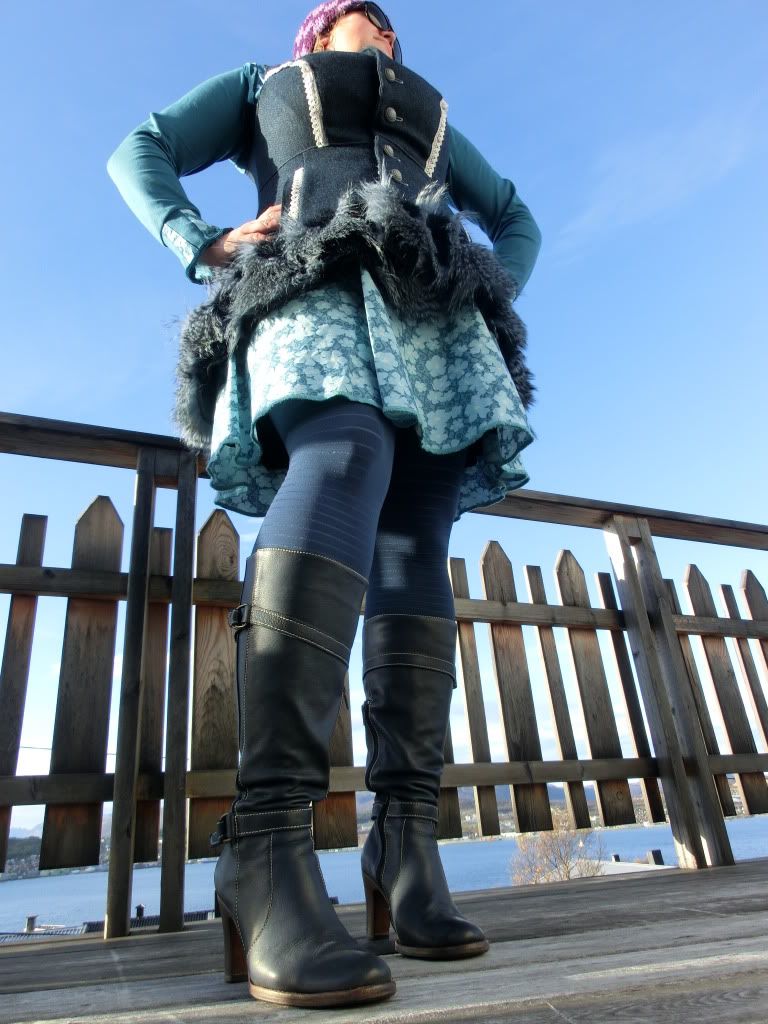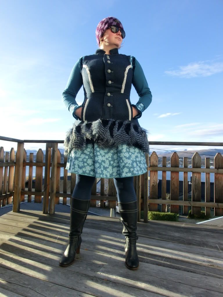 Nok et "frihåndsprosjekt". Det eksisterer ikke noe mønster til denne. Den ser nok ut som en redesignjakke, men det er kun nye materialer i den. Jeg har brukt ullfilt fra ulike steder, den grønne er fra stoff og stil ( jeg har mest lyst til å kalle den for acrylfilt...). Resten er av god kvalitet fra lokal forhandler. Foret er av stretch satin fra TISSU, knappene er fra TEXTART og juksepelsen er fra ShadesOfGloryFabrics.
